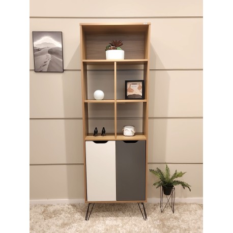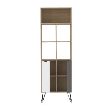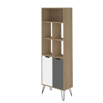 Structure en bois vertical avec une niche ouverte, quatre compartiments centraux, deux portes contrastées en bas et des pieds métalliques fins.