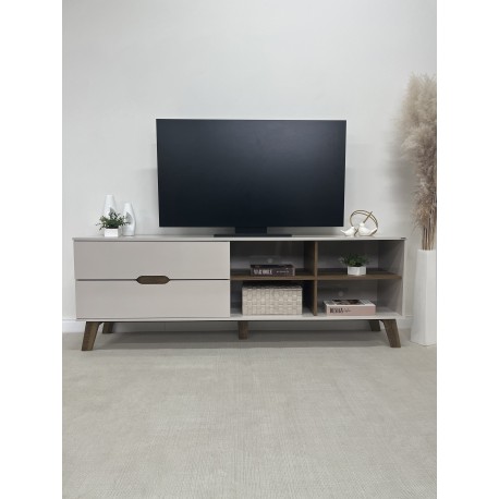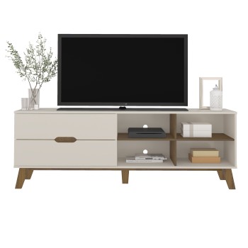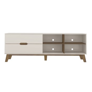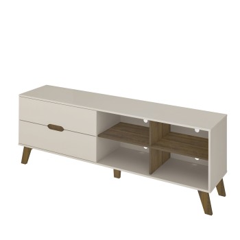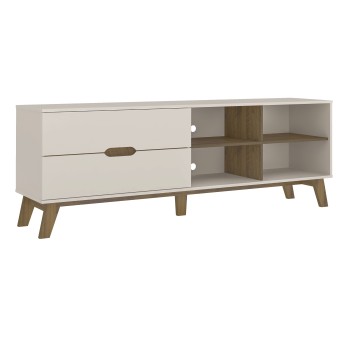 Structure en panneaux de particules recouvert de papier peint bicolore effet bois et blanc.