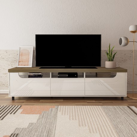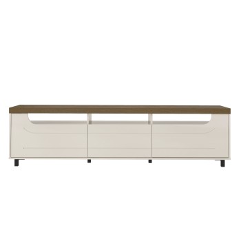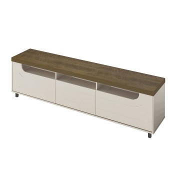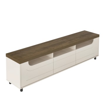Structure en panneaux de particules recouvert de papier peint bicolore effet bois et blanc.